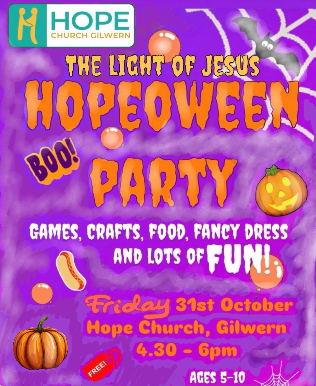 Hopeoween is a fun evening for children between the age of 5-10 to come to a safe indoor event where there will be crafts, games, and songs to enjoy. This is a church based event where the theme for the evening will be the light of Jesus that shines out in a dark world